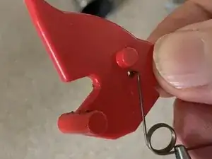 Чтобы установить новую пружину, снимите спусковой рычаг с узла и проденьте крючок пружины через отверстие в рычаге, затем наденьте виток пружины на Т-образную планку у основания рычага.