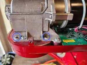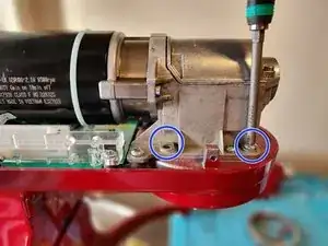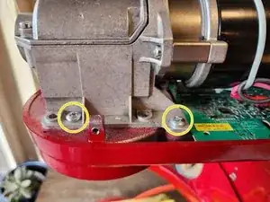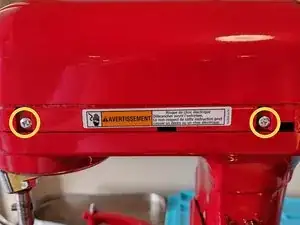 Крестовой отверткой #2 снимите четыре винта (указаны жёлтым, по два с каждой стороны), крепящие силовую передачу/двигатель к корпусу миксера.