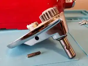 Сборка силовой передачи состоит из двигателя, коробки передач и передающих шестерён. В отличие от предыдущих поколений миксеров KitchenAid с асинхронным двигателем и подъёмом чаши, где эти элементы были разделены на отдельные детали, в этой модели это единый узел и он должен заменяться целиком.