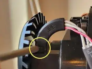 Отключите планетарный механизм от приводного вала двигателя, вынув фиксирующий штифт (обведён жёлтым). Для этого можно использовать молоток и либо кернер, либо отвертку Torx T15. Просто забейте кернер/отвертку по штифту, пока он не выйдет с другой стороны.