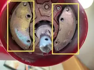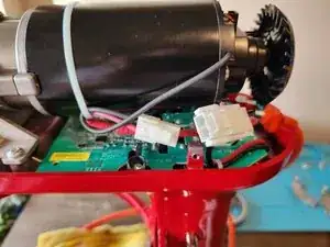 Используя крестовую отвертку #2, выкрутите два винта (обведены жёлтым на первом изображении), которые держат узел управления скоростью/двигателем.