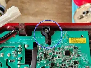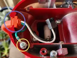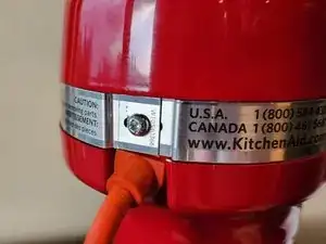 Используя крестовую отвертку #2, выкрутите винт (обведён жёлтым), который крепит заземляющий провод к корпусу миксера.