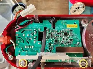 Используя крестовую отвёртку #2, удалите два винта (обведены жёлтым на первом изображении), удерживающие узел управления скоростью/двигателем.
