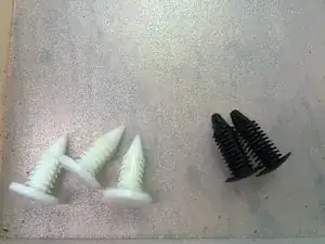 Оригинальные защелки (белые) и найденные мною заменители (черные). Заменители - AuVeCo #19149: головка 3/8", ширина стебля 7/32", длина 5/8". Fastenal предлагает их с артикулом 11120582 в упаковке по 50 штук (мне потребовалось 42).