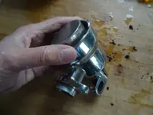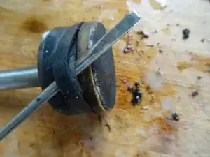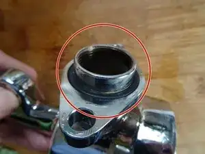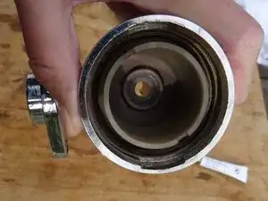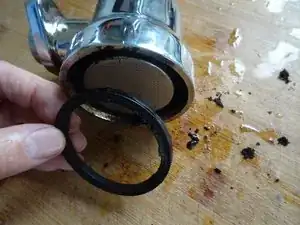 Под стопорным кольцом находится перфорированный латунный диск, а под ним — силиконовое уплотнение. Снимите латунный диск. Используйте пластиковый инструмент, чтобы выдавить силиконовое уплотнение с другой стороны.