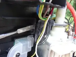 Возьмите прочную отвёртку и с усилием толкните крепление в сторону бака для воды, пока оно постепенно не выйдет вместе с насосом.