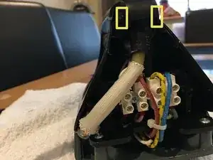 Отожмите направляющую основного кабеля от шарнира (жёлтый). Заднюю крышку можно опустить вдоль кабеля, чтобы она не мешала. Снимите направляющую кабеля, учитывая ориентацию относительно трубки подачи воды. Кабель теперь свободен.