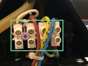 Ослабьте семь из восьми винтов (зелёные), оставив верхний левый винт подключённым (красный) на клеммном блоке: синий, зелёно/жёлтый, коричневый и чёрный. Позже вы установите их обратно в те же самые места, запомните их расположение.