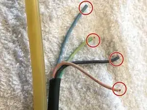 Аккуратно потяните каждую жилу, чтобы проверить, не оборвана ли она уже; в моём случае несколько жил были повреждены и растянулись при натяжении. Отметьте место распорки (strain relief) на сетевом кабеле, поскольку при сборке вам нужна будет та же длина (чтобы кабель не был слишком коротким или слишком длинным).