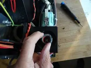 Приподнимите верхнюю крышку слегка вверх и ослабьте гайку, фиксирующую кольцевой наконечник на зелёно-жёлтом проводе заземления. Снимите кольцевой наконечник.