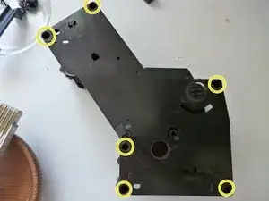 Удалите шесть винтов Torx T15, скрепляющих варочную группу. Отверстия под винты довольно глубокие.