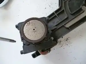 Снимите верхний поршень. Всё ещё остаётся шланг, соединяющий поршень с выпуском кофе. Сверху также находится прижим варочной группы.