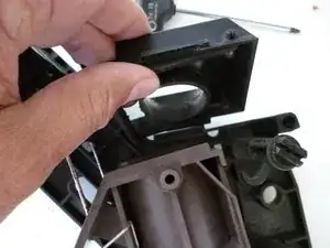 С некоторой силой вытащите ручку открытия из направляющей рядом с красной кнопкой.