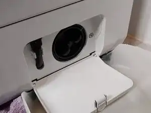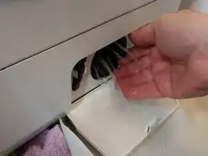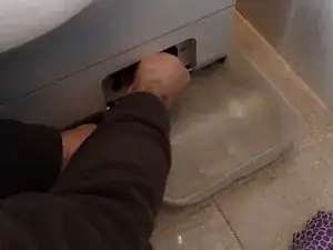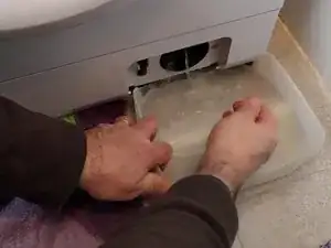 Насос расположен в нижнем лотке, нужно повернуть крышку фильтра на пару оборотов, НЕ ОТКРУЧИВАЯ ЕЁ ПОЛНОСТЬЮ — таким образом мы медленно открываем и закрываем, чтобы вода вытекала постепенно и не затопила помещение.