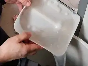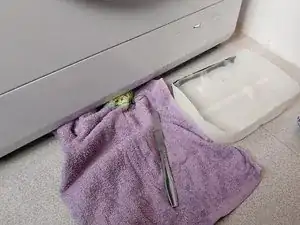 Я подготавливаю материалы, необходимые для открытия сливного насоса, чтобы опорожнить барабан. Я использую основание 25‑литровой канистры для моющего средства, которое обрезаю под размер зазора стиральной машины.