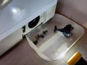 Когда вся вода ушла, можно снять крышку. И сюрприз — вот что вызывает засорение: различные предметы, которые мы оставляем в карманах и которые попадают в барабан.