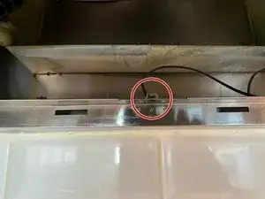 После снятия решёток и панели мы найдём датчик в задней части вытяжки, по центру, прикрученный к задней стороне металлической детали.
