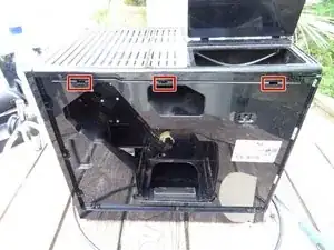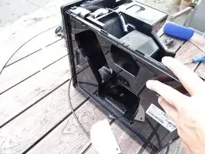 Вставьте пластиковый инструмент в щель между передней панелью и правой боковой панелью и расширьте ее. Затем толкните боковую панель назад. Она может быть очень тугой, и вам, возможно, потребуется приложить силу.