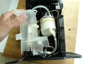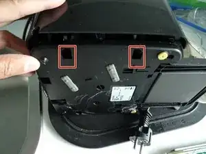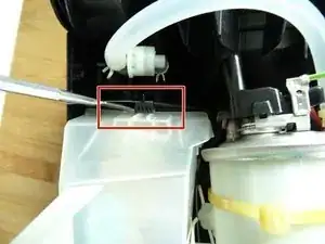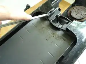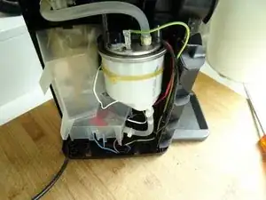 В этот момент боковая панель всё ещё защёлкнута спереди, рядом с соплом для кофе. Можно осторожно поддеть защёлку отверткой.