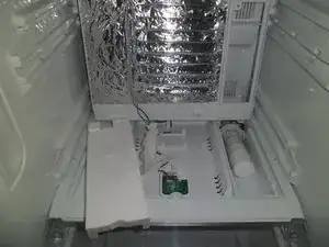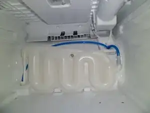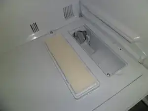 За нижним ящиком находится пластиковая панель, которую можно легко отщёлкнуть. Теперь видно резервуар для воды для водораздачи. Также справа видно трубки для фильтра. Винтов нет.