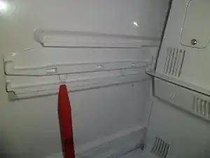 Сначала выньте три ящика. Верхний — для мяса, средний — для витаминов, нижний — зона свежести. Между отделениями для мяса и витаминов находится дно, защёлкивающееся клипсами. Используйте пластиковый инструмент или деревянную полоску, чтобы открыть клипсы и снять дно. Винтов нет.