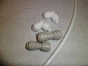 Теперь вам понадобятся соединительные муфты. Переходник с 6,35 мм (1/4") на 8 мм (5/16"), муфта 6,35–6,35 и кусок шланга 6,35 мм. Аккуратно отрежьте шланг ровно и чисто острым ножом. Затем просто защёлкните эти детали между собой. Теперь у вас есть байпас для оригинального места установки фильтра.