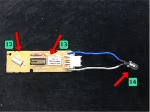 Управление световыми и звуковыми сигналами. На печатной плате напротив каждой кнопки панели управления расположены 3 светодиода, а также зуммер. Сигналы, излучаемые этими компонентами, описаны в шаге 3 руководства «различные функции». Ещё один светодиод (Ref. 14) подключён к небольшой плате, размещённой в ручке утюга.