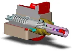 Вода входит с одной стороны насоса (жёлтая стрелка), проходит через цилиндр (Ref. A) и попадает в розовую камеру. Эта камера поочередно перекрывается двумя клапанами, розовым (Ref. B) и синим (Ref. C). Розовый позволяет воде войти в камеру, когда поршень отходит, а синий автоматически закрывается (из‑за противодавления).