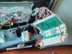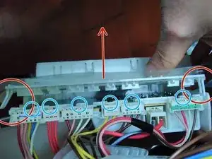 Снимите все разъёмы с модуля управления, слегка отогнув защёлки в сторону (синие отметки)