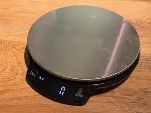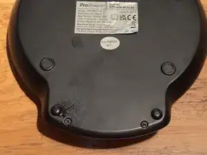 На нижней стороне есть наклейка. Под этой наклейкой вы найдёте два винта, удерживающих платформу. После снятия платформы вы увидите внутри кольца четыре винта с крестообразной шлицей. Удалите их и два одинаковых винта внизу. После этого вы сможете разделить нижнюю и верхнюю пластиковые части, чтобы добраться до внутренностей.