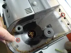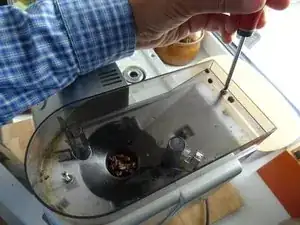 Контейнер для зерен фиксируется двумя винтами с крестообразной головкой. Открутите их. Регуляторы мельницы и кофе могут остаться.