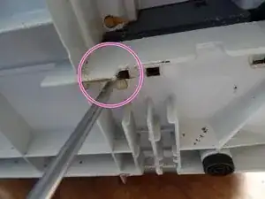 С правой стороны на полу находятся несколько прямоугольных отверстий. На третьем есть захват, с помощью которого полная единица прикреплена. Его нужно отодвинуть назад, после чего вы сможете поднять весь блок вверх. Иногда он застревает, когда машина очень грязная.