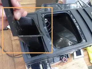Поднимите боковую панель со стороны резервуара для воды немного вверх и вытяните снизу. Затем снимите её и отложите в сторону.