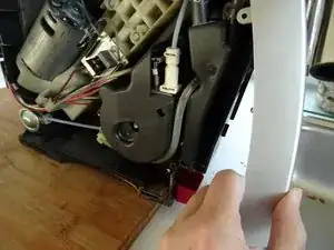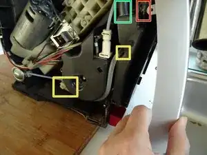 Рамка все еще защелкнута внизу слева внутри по вертикали. Освободите защелки и аккуратно поднимите панель мимо кофейного носика.