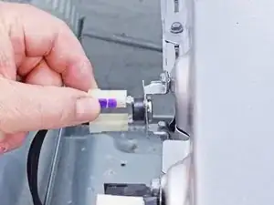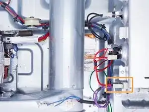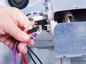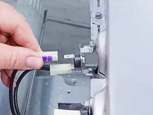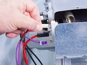 Вытяните два плоских разъёма температурного предохранительного выключателя прямо из их посадочных мест, чтобы отключить их.