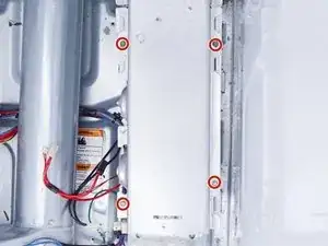 Используйте головку‑отвёртку на 1/4 дюйма, чтобы вынуть два листовых винта длиной 12,8 мм, которые закрепляют блок предельного термостата/входного термистра.