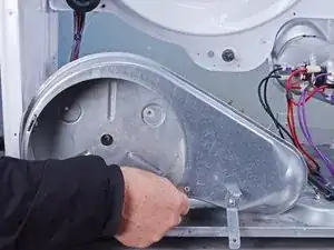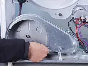 Сдвиньте вентиляционную трубу к задней части сушилки, чтобы освободить её от корпуса вентилятора, и снимите.