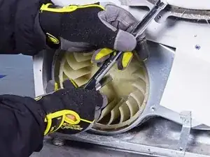 Используйте трещотку с удлинителем и без головки, чтобы вставить её в квадратное отверстие на рабочем колесе вентилятора.