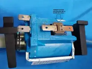 Изображение 3: Защитный термостат водяного насоса, подключённый последовательно с насосом. Он также переплетён с одним из питающих проводов.