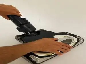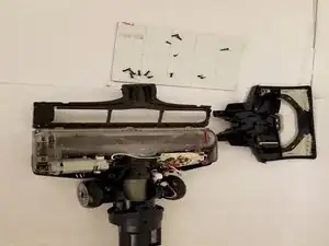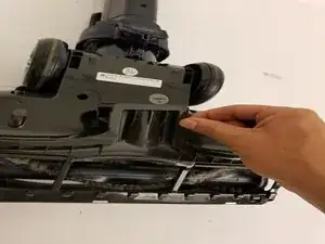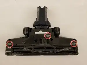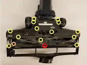 Удалите горизонтальный винт (обведенный оранжевым), который крепит серую боковую панель (необходим для удаления белой крышки на вращающейся щетке на шаге 8).