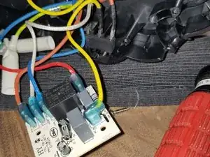 Отсоедините защитный провод (зелёно-жёлтый) от металлической пластинки (красный круг).