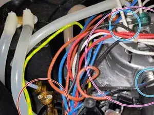 Красный круг: выход помпы. Думаю, полупрозрачный шланг справа — предохранительный сброс давления (так как возвращается в резервуар для воды). Тонкий слева идёт в нагревательный блок.