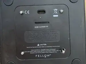 Винты скрыты под этикеткой. Их можно почувствовать, надавливая на поверхность. Проткните её треугольной насадкой для шуруповёрта, подходящей по размеру к чайнику.