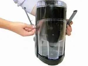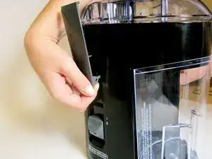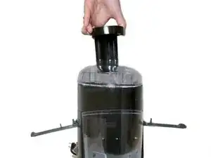 Чтобы вынуть контейнер для жмыха: Держите носик сока одной рукой, а задний край сепаратора жмыха другой рукой. Поднимайте его, не забывая держать нож/ситечко на месте.