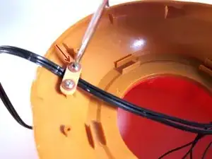 Эти винты удерживают провод, направляя его правильным образом наружу из корпуса. (Это два винта, прикреплённые к небольшой оранжевой детали)