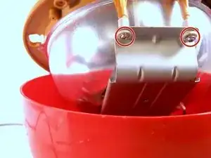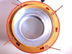 Поднимите белую чашу и металлическую чашу (с оранжевой окантовкой) насколько это возможно, чтобы получить доступ и отвинтить два винта с металлической части.