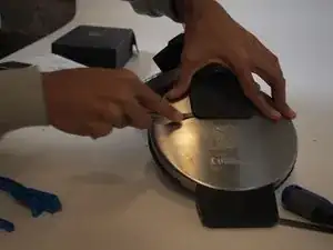 Используйте металлическую лопатку, ломик или другой тонкий съемник, чтобы ослабить пластиковой крышку на верхней стороне.