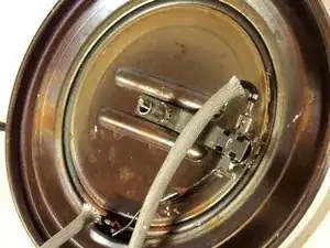 Термовыключатель (металлический диск с чёрным дном, подключённый к проводке)