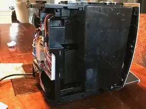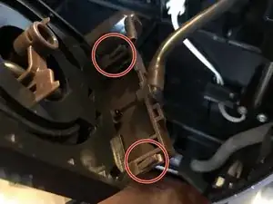 Нужно выкрутить шесть винтов, отмеченных красными кругами, прежде чем можно будет снять верхнюю часть. Один под каждой из левой и правой верхних шарнирных крышек, два под задней верхней крышкой и два под дверцей загрузки молотого кофе; винт, ближайший к резервуару для воды (другой держит хромированную пластиковую часть к верху).