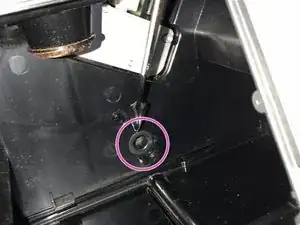 При желании можно снять заднюю верхнюю крышку, осторожно покачивая каждый шарнир вверх (отмечены розовыми кругами), пока крышка открыта. Лёгкое давление в стороны может освободить шарниры. Также ослабьте фиксированный винт в области бункера, после чего можно снять решётку, аккуратно сжав вместе два шарнира.